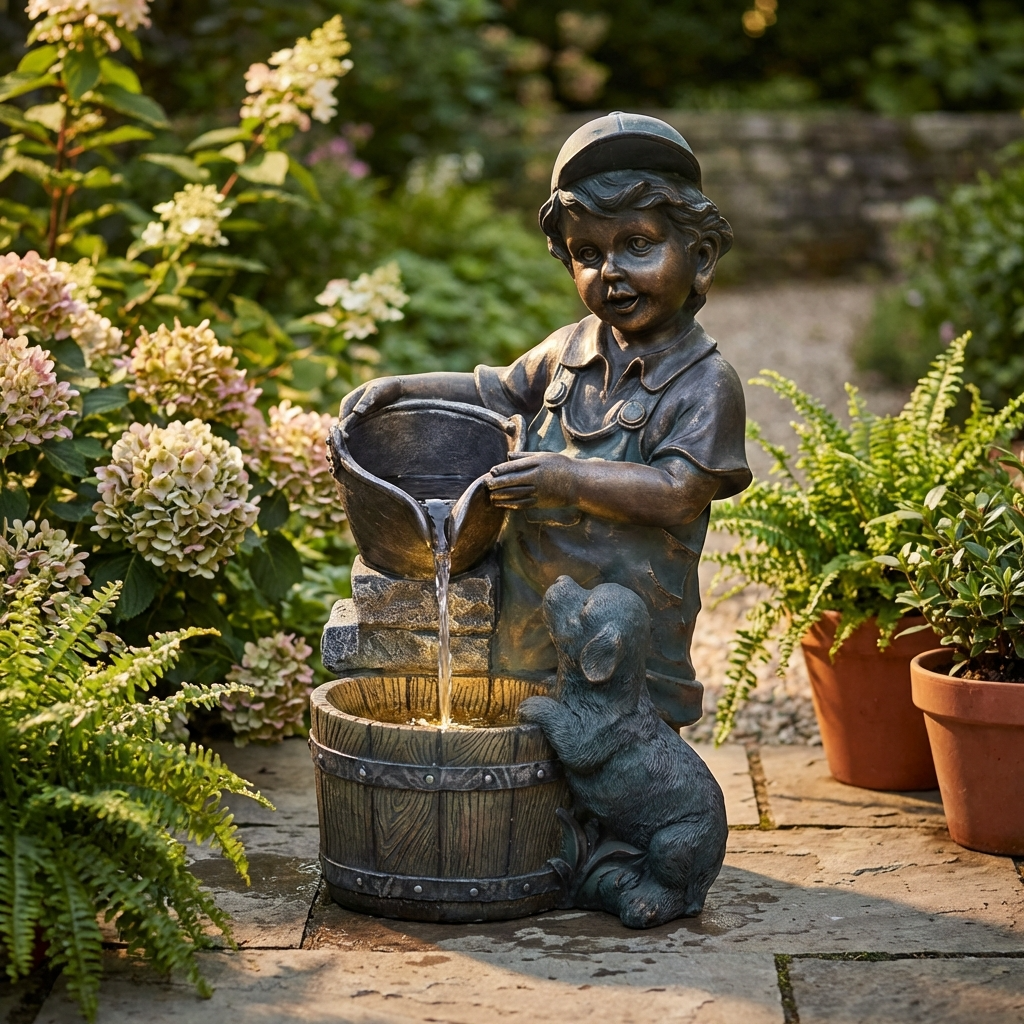 Design : Sculpture détaillée d’un enfant versant de l’eau dans un tonneau, accompagné d’un petit chien curieux.